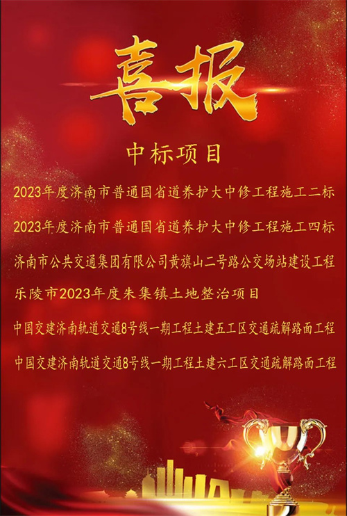 面對(duì)日趨嚴(yán)峻的市場(chǎng)競(jìng)爭(zhēng)環(huán)境,公司周密策劃,制定針對(duì)性強(qiáng)、可行性高的投標(biāo)方案和應(yīng)對(duì)策略,精心部署、多方調(diào)度,成功中標(biāo)2023年度濟(jì)南市普通國(guó)省道養(yǎng)護(hù)大中修工程施工二標(biāo)和四標(biāo)兩個(gè)標(biāo)段、濟(jì)南市公共交通集團(tuán)有限公司黃旗山二號(hào)路公交場(chǎng)站建設(shè)工程、樂(lè)陵市2023年度朱集鎮(zhèn)土地整治項(xiàng)目、中國(guó)交建濟(jì)南軌道交通8號(hào)線一期工程土建五工區(qū)、六工區(qū)交通疏解路面工程六個(gè)項(xiàng)目施工。其中,中標(biāo)的樂(lè)陵市2023年度朱集鎮(zhèn)土地整治項(xiàng)目,在土地整治項(xiàng)目市場(chǎng)合同額首次突破千萬(wàn)元大關(guān)。